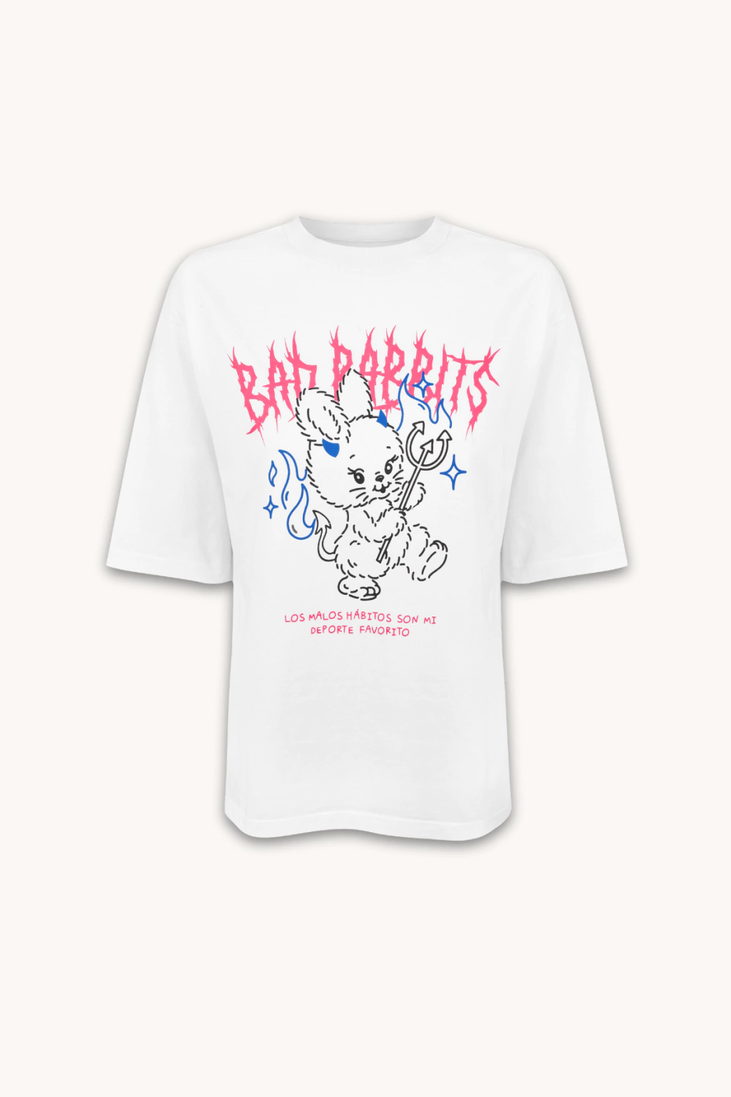 Sua modelagem é oversized, a estampa é em preto, azul royal e pink. Já o decote é em rib larguinho.
