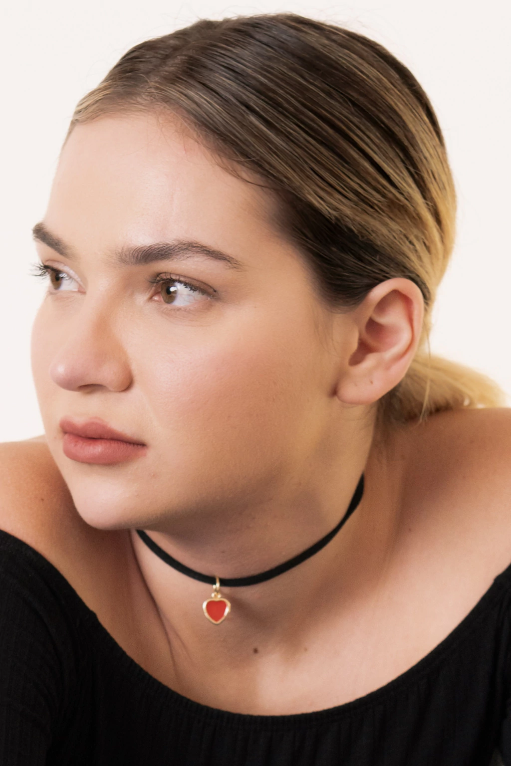 Chocker confeccionada em elástico e metais dourados, pingente de coração esmaltado em vermelho, pra adicionar um toque de cor (e atitude) no look.